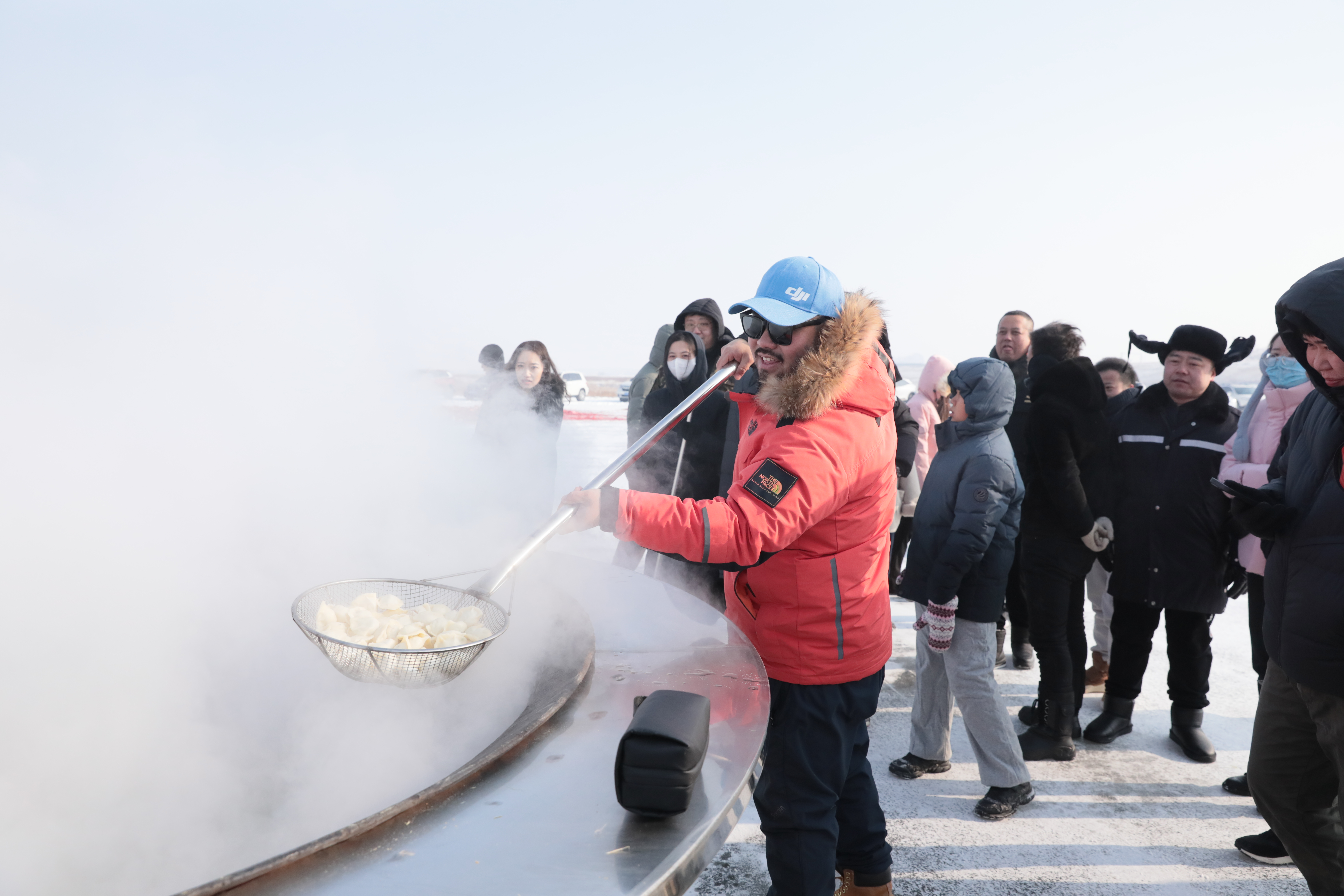 ? ? 活動現(xiàn)場,咕嘟冒泡的大鐵鍋里煮著熱氣騰騰的餃子,現(xiàn)場工作人員的熱情驅(qū)散嚴(yán)寒,一碗餃子一口熱湯,最是溫暖。傳統(tǒng)的采冰文化中沸騰著呼和浩特人的豪放與熱情。
